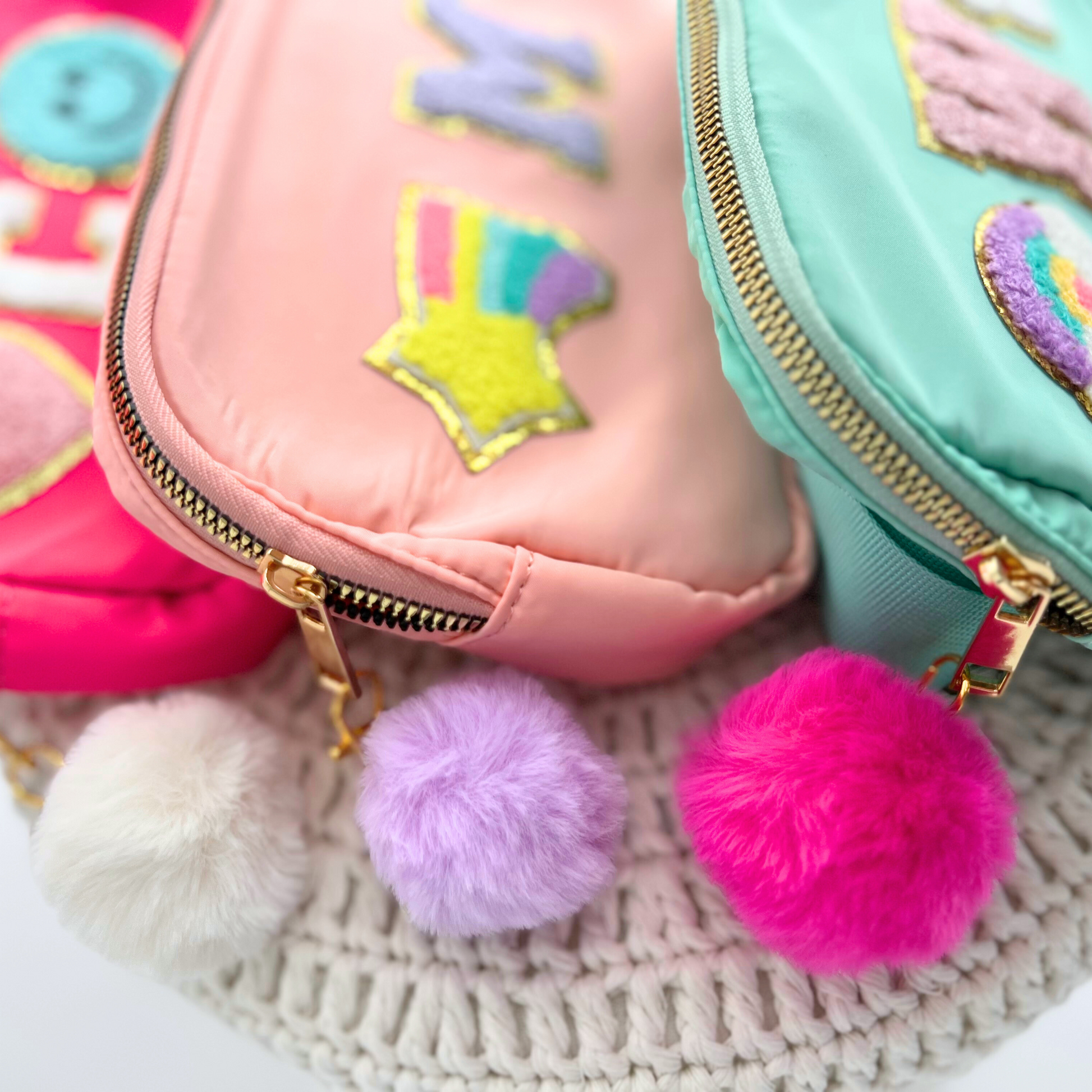 - Pom pom charms come in mint green, pink, light pink, purple, white, and gold