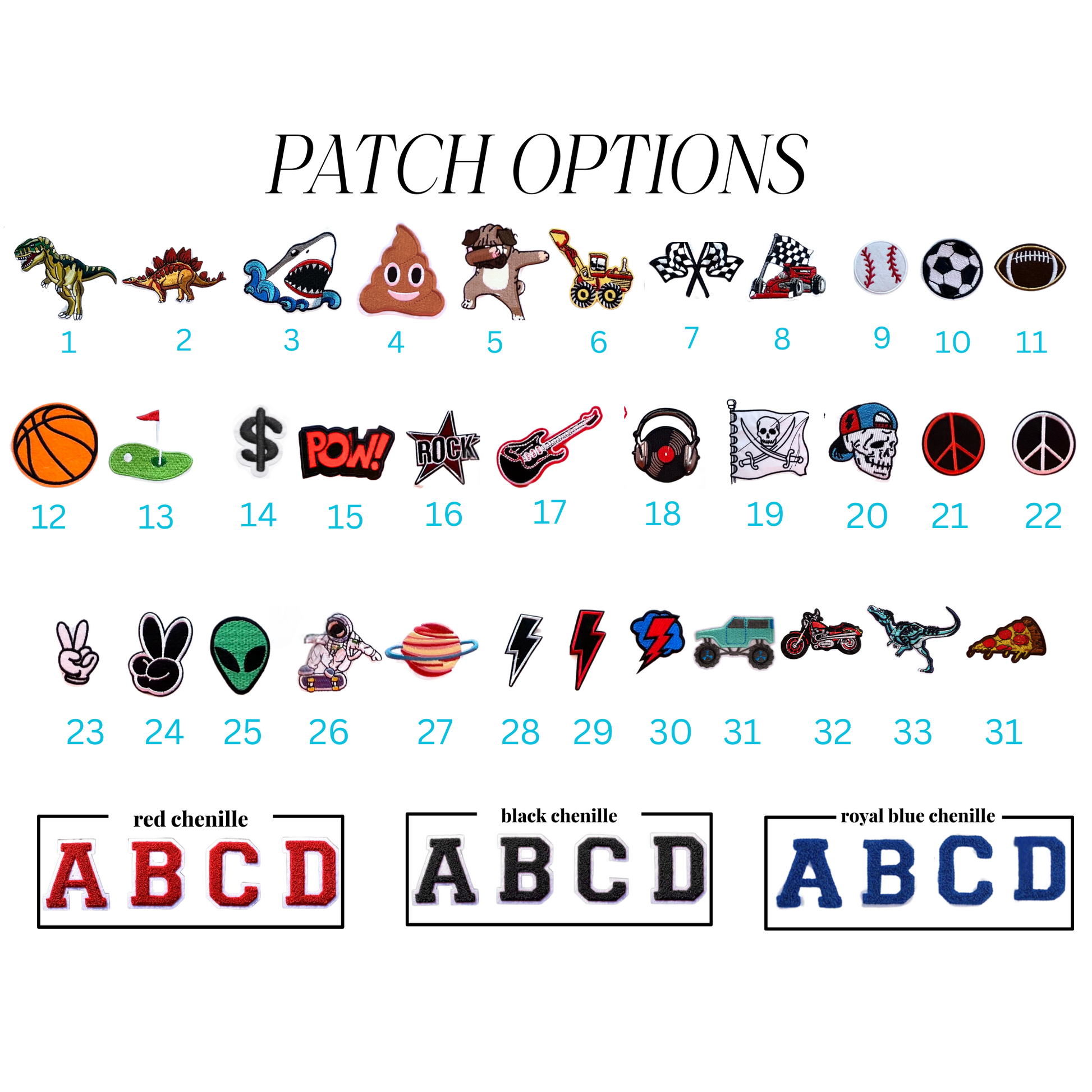 - Soft chenille letter patches with white felt outline