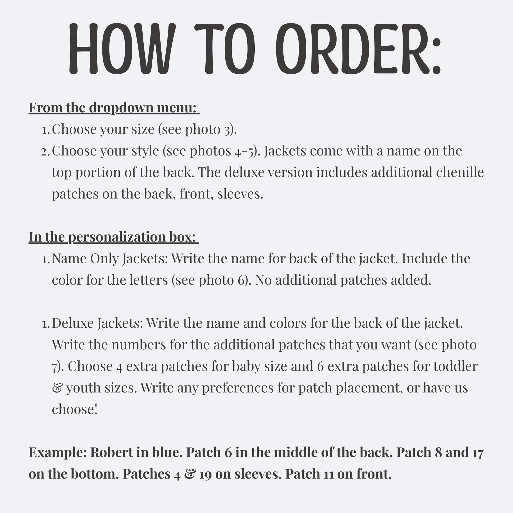 - For deluxe jackets: Choose your additional patches (photo 7). Write number for each patch.