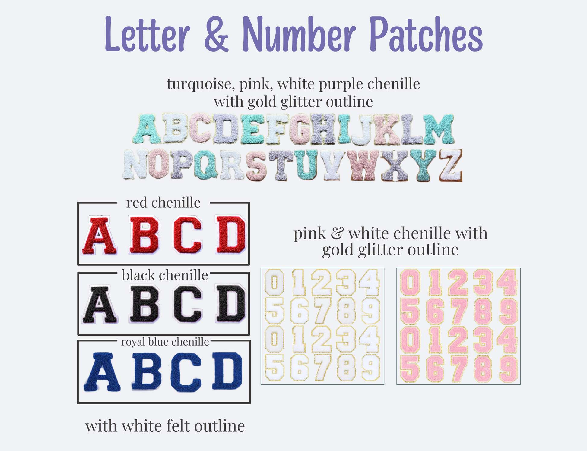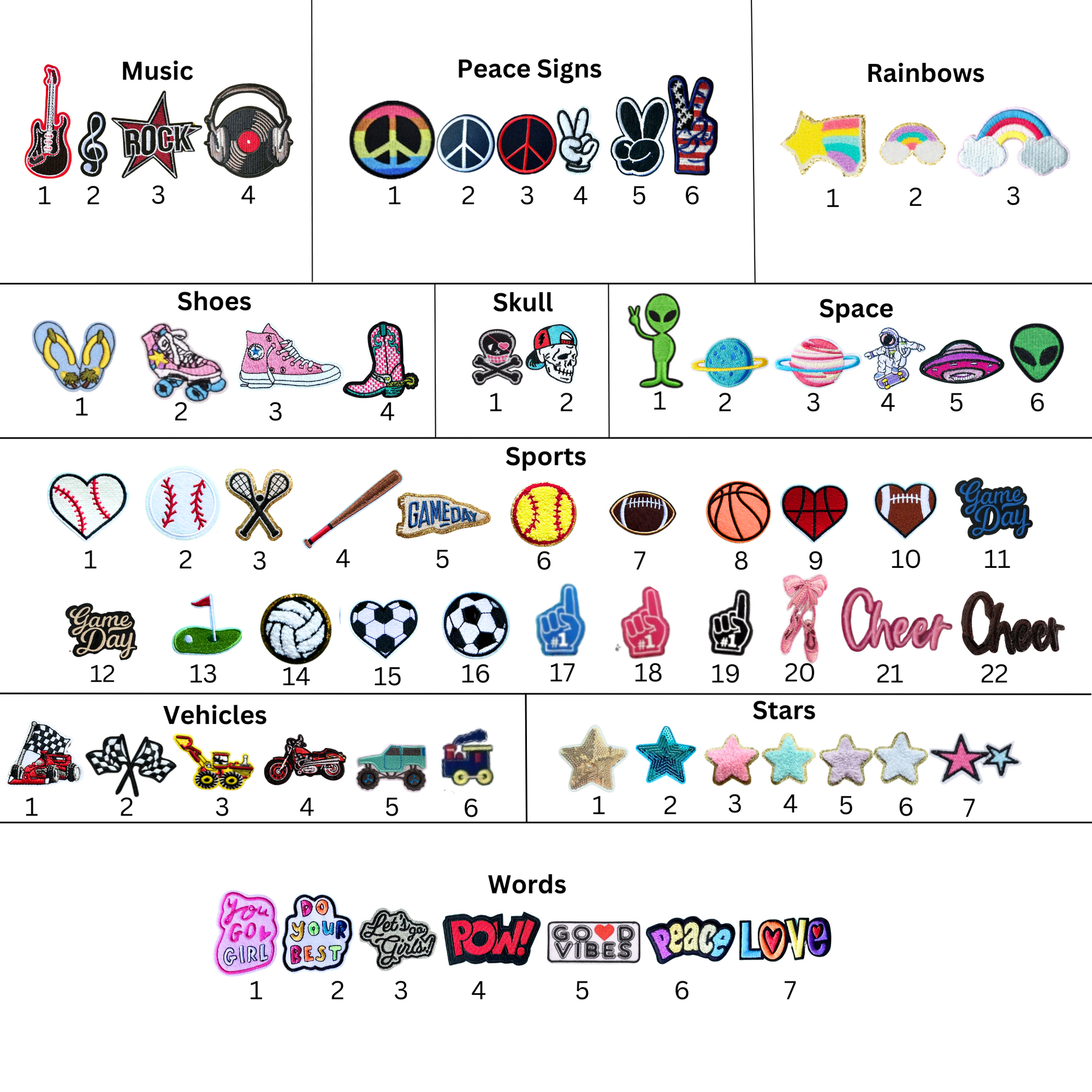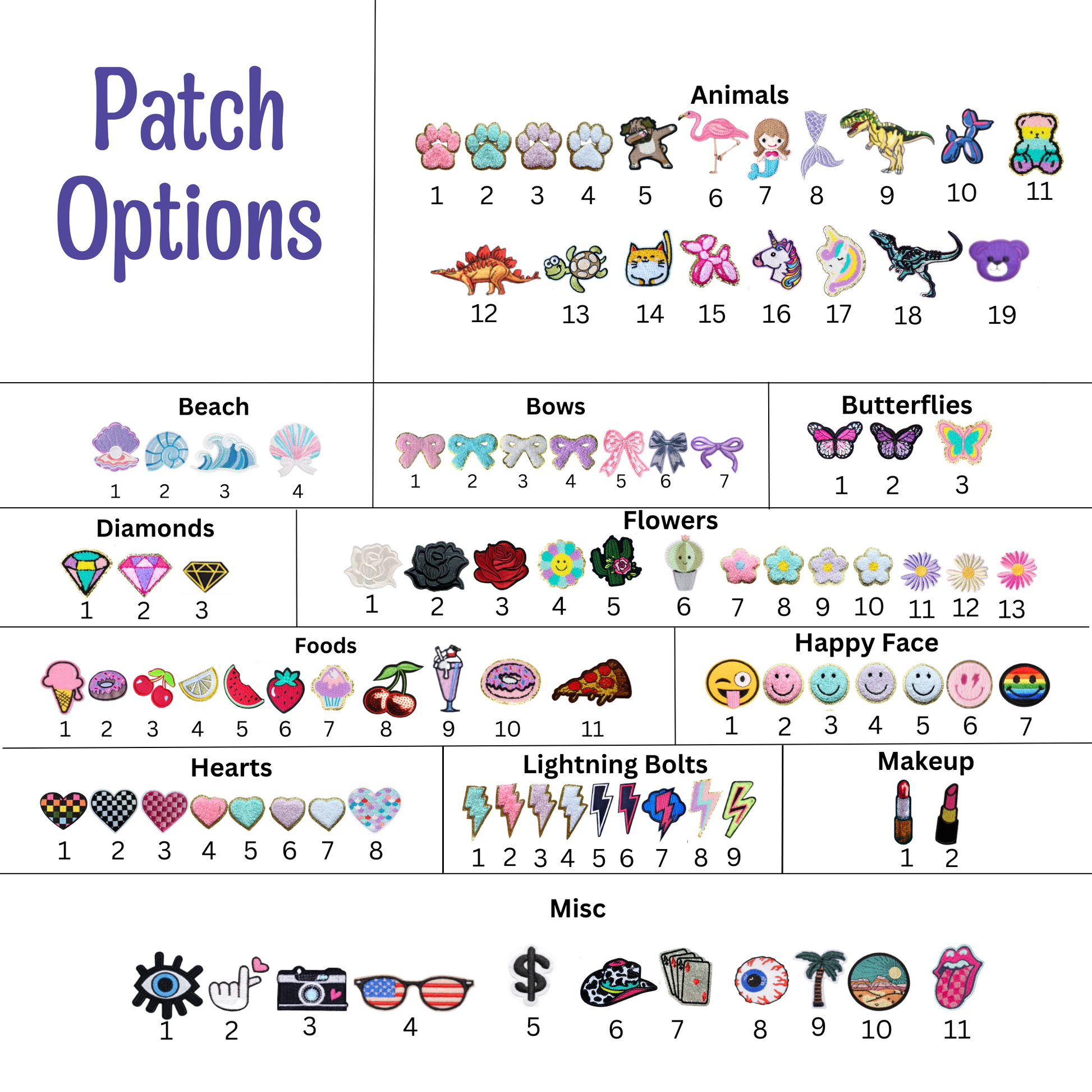 Patches in the graphics are NOT true to size. Some photo sizes were adjusted to show detail. Please message us if you have a question about patch sizes!