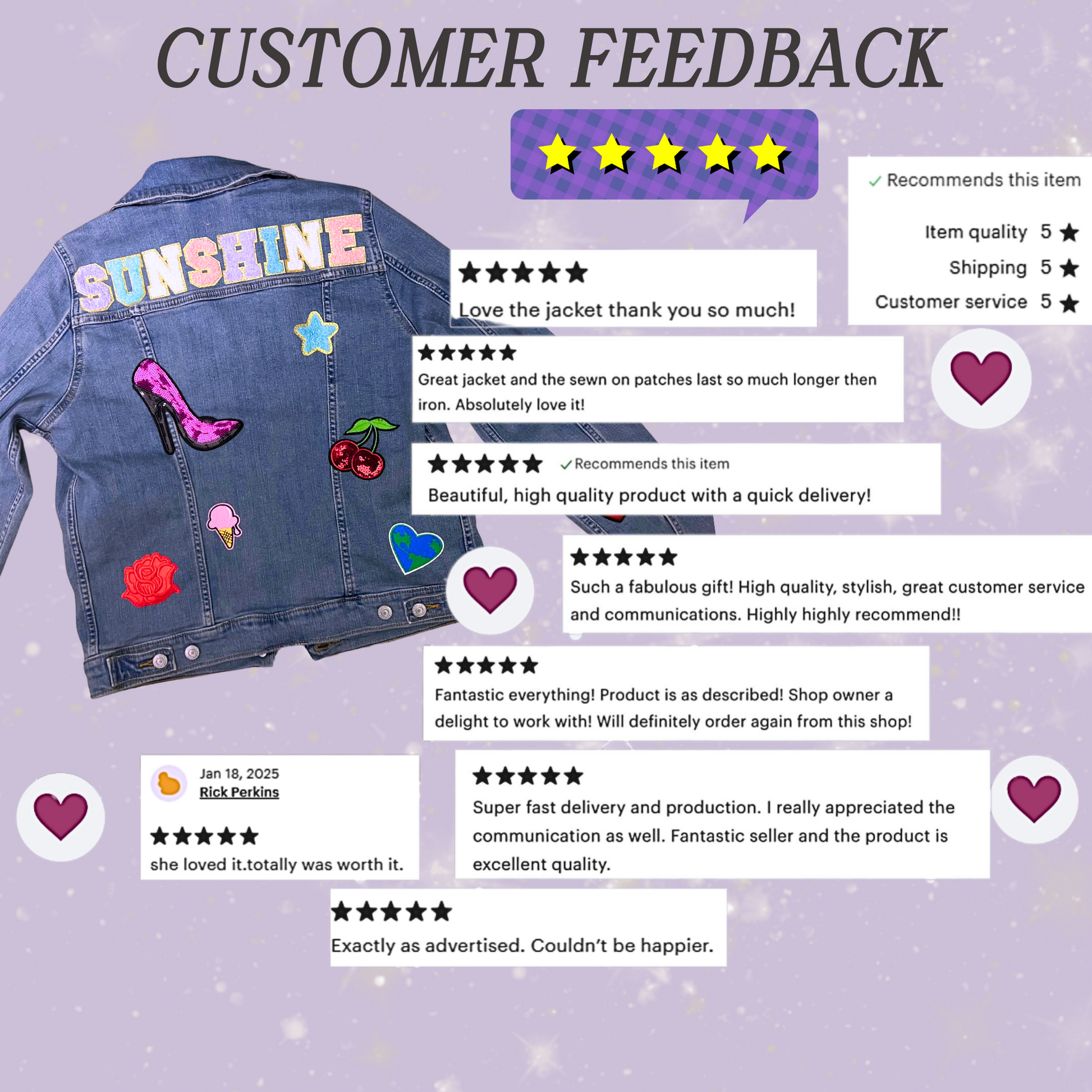 Each jacket is handcrafted with up to 13 sewn-on chenille or embroidered patches, in addition to the name or word of your choice across the back. Choose your patch colors, themes, and placement—or let us design something fabulous for you. Whether you're planning a birthday gift, a girls trip outfit, or just treating yourself, this custom piece brings the cool.