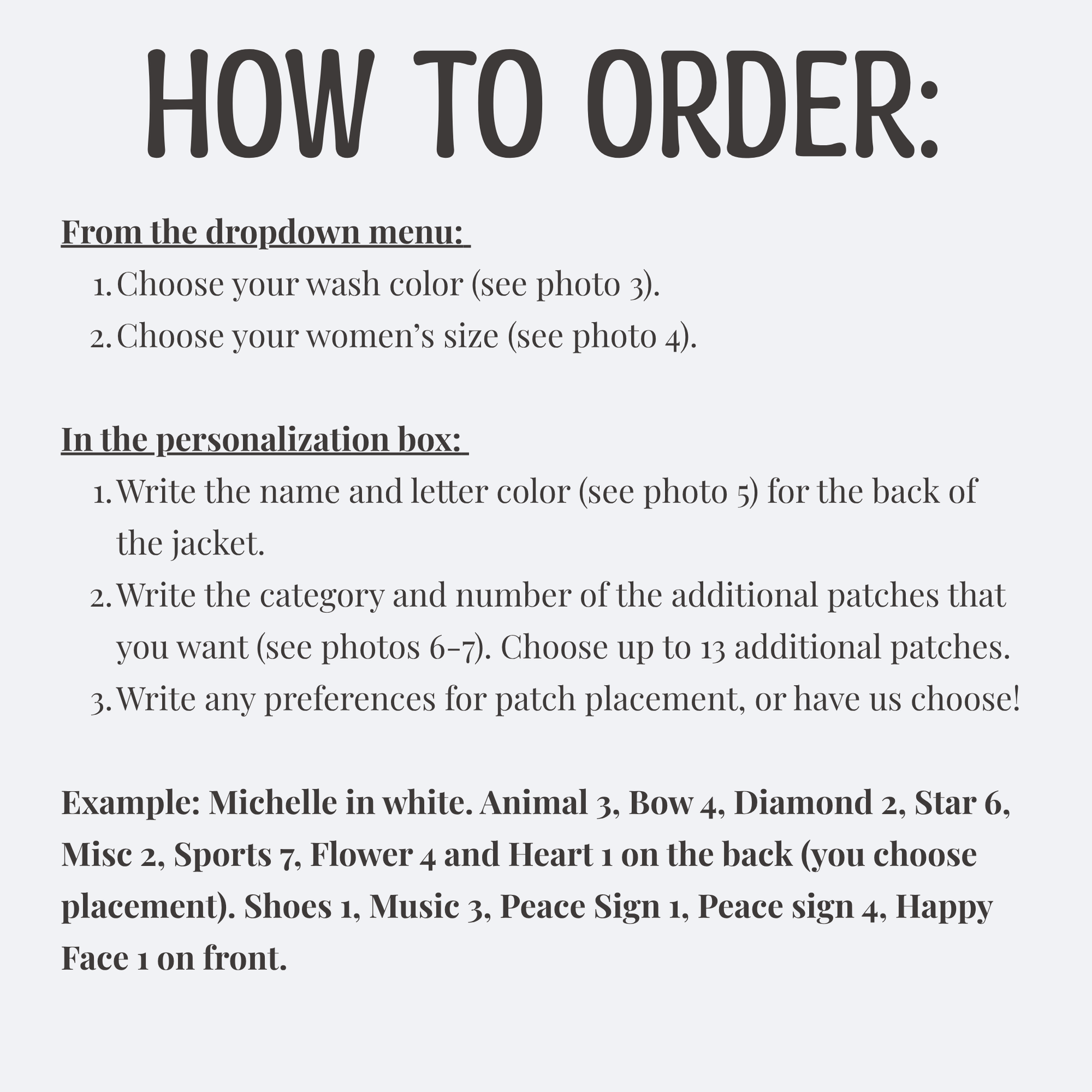 Write name & color for letter patches in the personalization box (see photo 5).