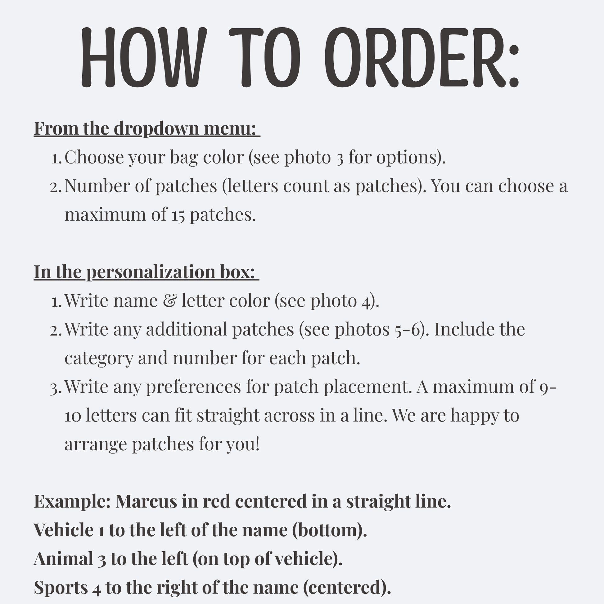 - Write any additional patches for your bag in the personalization box. Include the category and number for each patch (Example: Animal 4).
