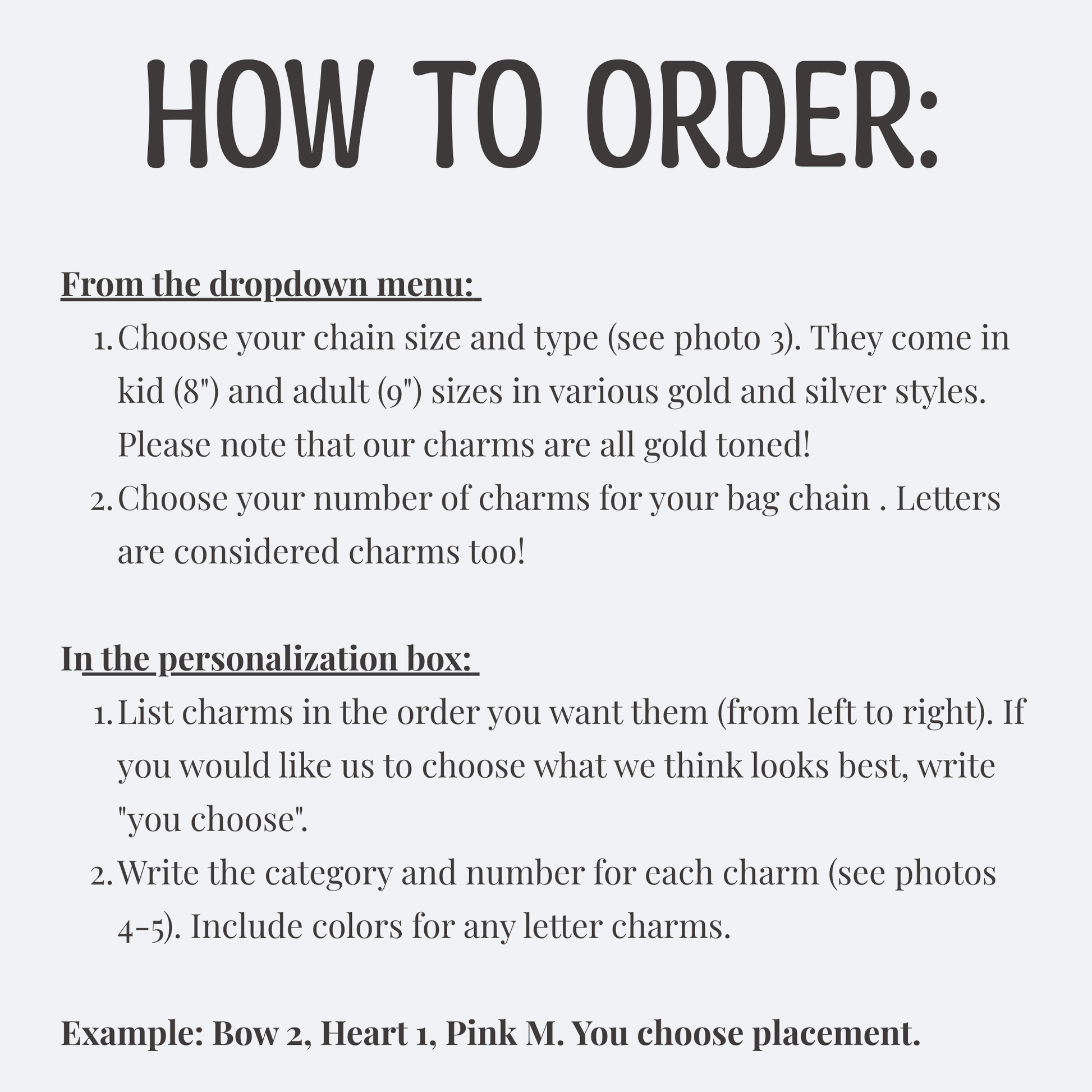 1. Choose your chain size and type from the dropdown menu (see photo 3). Kids chains are 8" long, adult chains are 9" long. List charms in the order you want them (from left to right). If you would like us to choose what we think looks best, write "you choose".